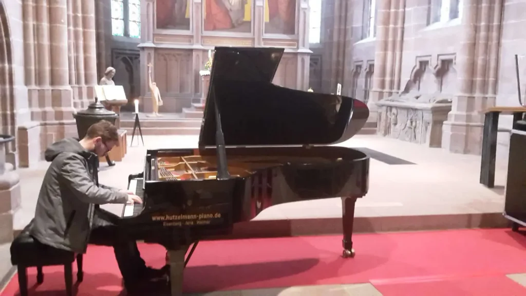 Der Pianist Lukas Fischer spielt sich vor dem Konzert an unserem Steinway Leihflügel ein.