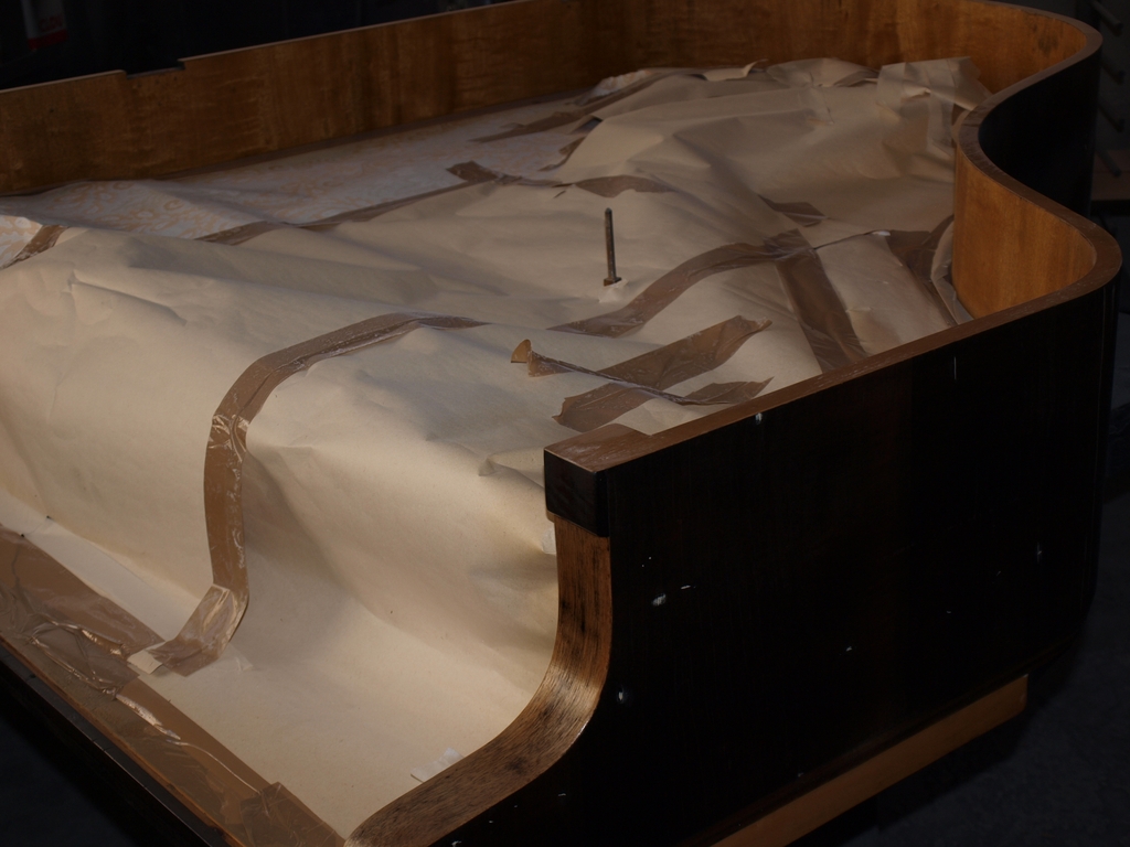 Abschleifen des Altlackes und Beseitigung der Schäden an Holz und Furnier, Neulackierung in farblos, schwarz oder weiß, Schellack-Überpolierung, gewachste Oberfläche